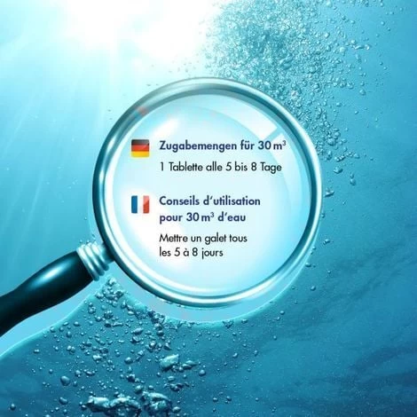 Notre chlore multifonction libère, en plus du chlore actif, environ 50% de son poids sous forme de stabilisant hydrolysé (acide isocyanurique). La teneur en stabilisant idéale est à maintenir entre 30 et 60 mg/l. Veuillez contrôler 1 fois par mois la teneur en stabilisant et la maintenir inférieure à 75 mg/l.
