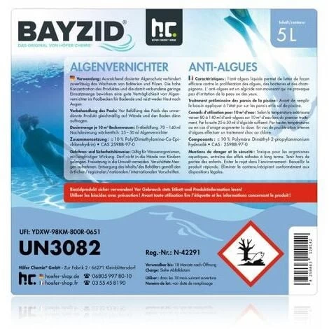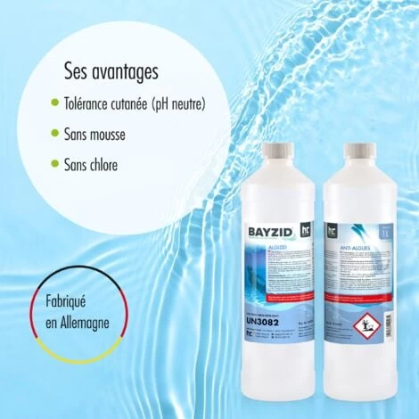 Bayzid est un anti-algues non moussant Ă double action curative et prĂ©ventive permettant aussi bien de supprimer les algues dans l’eau de votre bassin que de lutter contre la prolifĂ©ration des bactĂ©ries et des champignons.