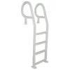 Pendant l’hiver, les vis peuvent être desserrées pour que l’échelle soit désinstallée. Au bas de l’échelle se trouve une butée en caoutchouc qui protège la paroi de la piscine des dommages.