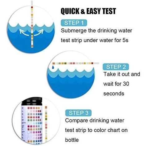 Facile à utiliser : trempez la bandelette de test dans l’eau pendant 5 secondes, suspendez-la en l’air pendant environ 30 secondes, puis faites correspondre la couleur de la bandelette de test au dos de la bouteille pour prendre une mesure. Les bandelettes de test d’eau potable Essieny sont faciles à utiliser, même pour les débutants