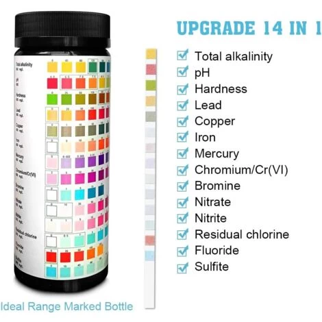 Test 14 en 1 amélioré : test complet pour l’alcalinité, le pH, la dureté, le plomb, le cuivre, le fer, le mercure, le chrome/VI, le brome, le nitrate, le nitrite, le chlore libre, le fluor, le sulfite.