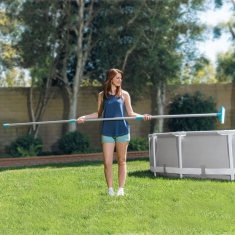Kit d’entretien Vac+ – Kit complet permettant de nettoyer efficacement toutes les piscines hors-sol disposant d’une filtration d’un dĂ©bit minimum de 3mÂł/h – Comprenant : une manche tĂ©lescopique en aluminium 279cm – Un aspirateur avec prĂ©filtre – Une Ă©puisette de fond – Une brosse de paroi.
