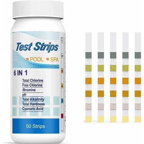 3.Bandelettes de test 6 en 1 pour piscine, spa etc.Testé sans chlore, ni brome, ni pH, alcalinité totale, dureté totale et sans acide cyanurique.