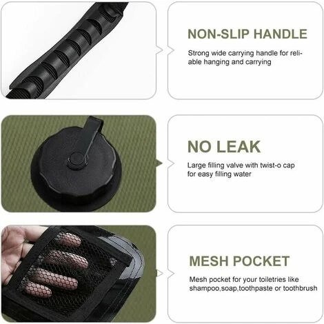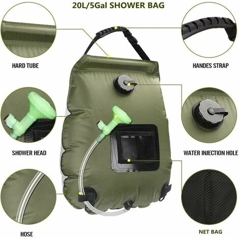 GRANDE CAPACITÉ – Ce sac de douche de camping peut transporter environ 20 litres (5 gallons) d’eau pour le lavage de la douche en plein air, vous permettant de laver facilement la saleté et la fatigue de n’importe où sur votre corps et de profiter de